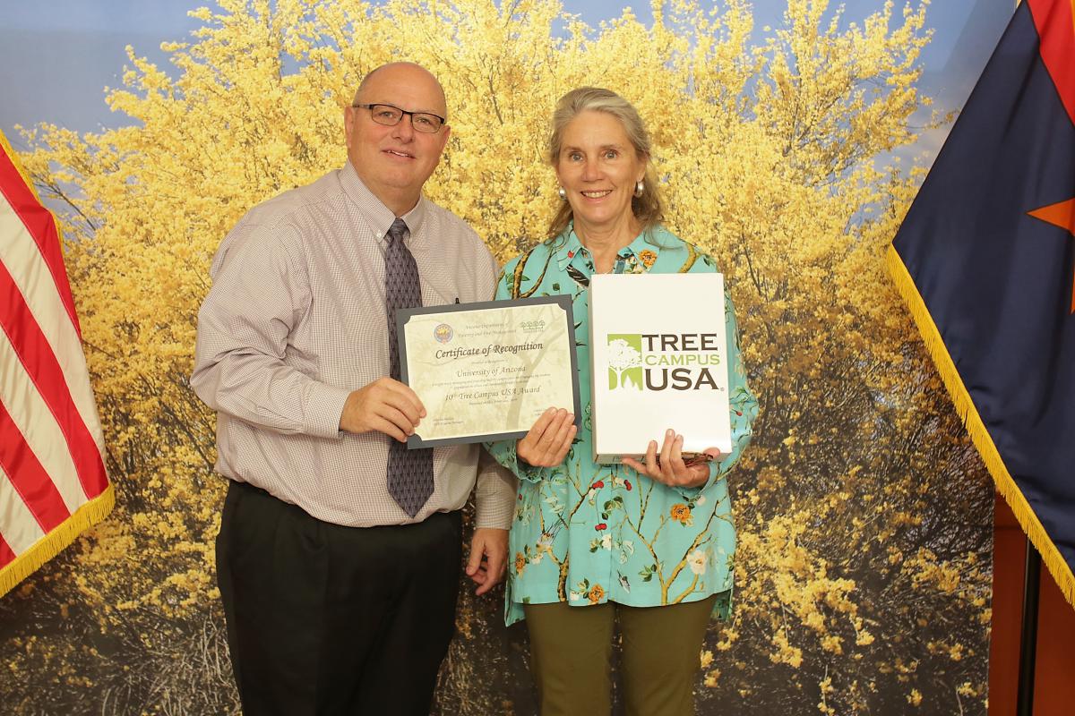 Each year, the State Forest office hosts an event on or around Arbor Day to celebrate trees and the multitude of benefits they provide. It includes a reading of the Arizona Arbor Day proclamation, an awards ceremony for Tree City, Tree Campus, and Tree Line USA, Citizen Forester of the Year, Magnificent 7 Trees, and a commemorative tree planting. On April 24th, 2019 the event was held at the Arizona State Capitol Building in Phoenix. Special thanks to Campus Arboretum Board Member Lori Woods, who attended along with other Campus Arboretum friends and supporters, to receive the award on behalf of the University of Arizona Campus Arboretum.