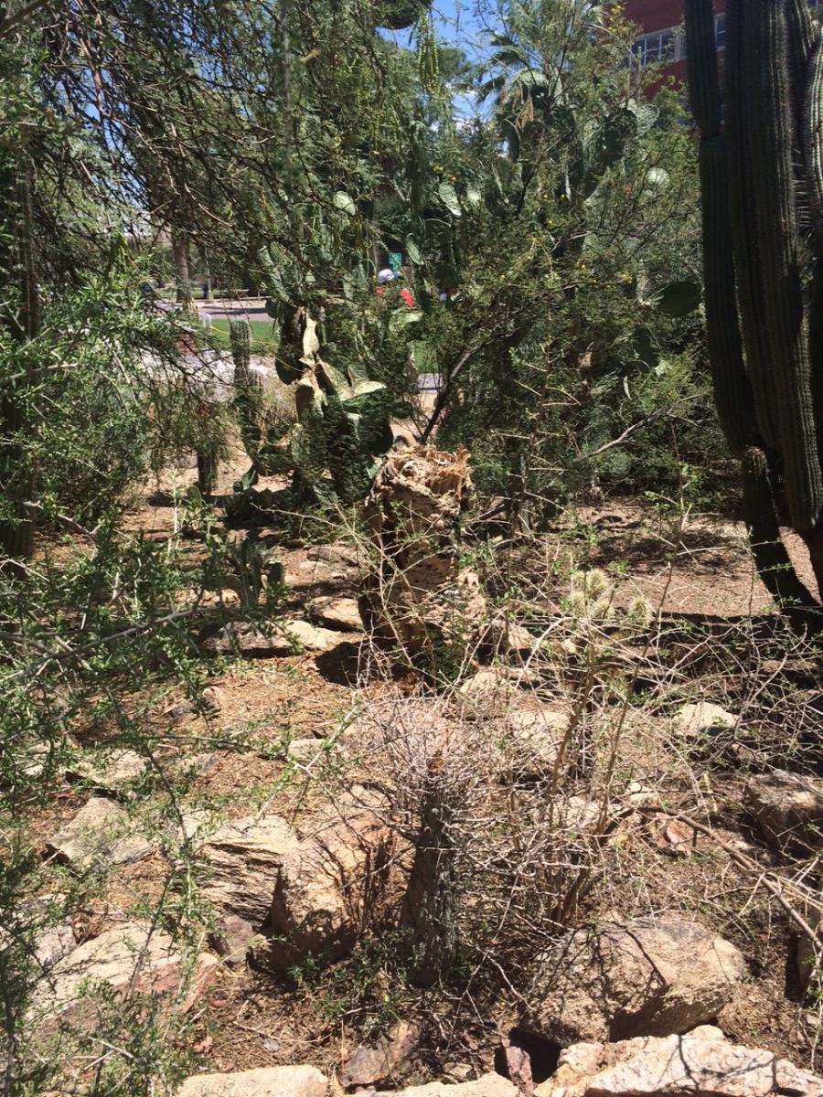 We proudly introduce a new generation of Boojum (Fouquieria columnaris) in the Joseph Wood Krutch garden! Thanks to Dick Weidhopf, and other generous donors, the UA Campus Arboretum was able to obtain a wonderful 6' tall 2-stemmed Boojum from California. The plants replace those planted in 1929 by President Homer Shantz which adorned the historic cactus garden and amazed visitors for almost a century. (The last of Shantz's original specimens was destroyed in 2014.) The story was also mentioned in our Oct. 2014 Newsletter. We are so thrilled to preserve this aspect of our botanical history! Kudos to Juan J Barba & Associate Arborists, Arizona Cactus and Tree Co. as well as UA Facilities Management for arranging for transport, and installation in the garden.
